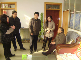 慰问组一行人来到许家村许双良的母亲家。这位老人非常热情又要沏茶拿糖。慰问组详细询问和查看他们的家庭生活情况,了解家中的经济现状。刘树春经理把礼品送到老人手里,老人激动的道谢给领导问好。临走时安全部长王建恩祝福老人过一个欢乐祥和的春节。